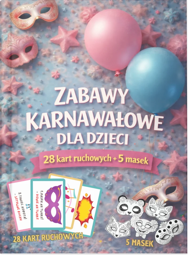Zamów „Zabawy karnawałowe dla dzieci – karty ruchowe + maski” i miej gotowy zestaw na każdy bal karnawałowy.